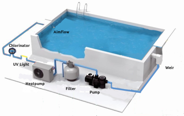 This is important, if the whole body of water is not filtered there are still plenty impurities in the water.A standard pool set up is, the pool, weir (water outlet), piping, water pump, water filter and aimflow (water inlet).